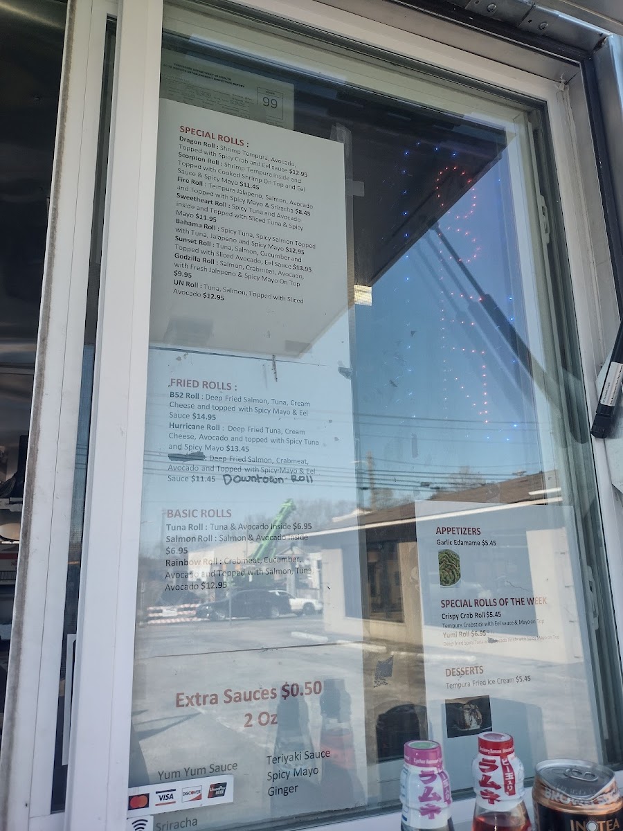 Spicy Crab, Cucumber, Cream cheese, topped with Smoked Salmon, Eel sauce and Spicy mayo